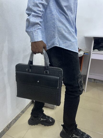 Elegant and lightweight Mont Blanc laptop bag crafted with premium faux leather, secure zip closure, and dual-tone Black & Brown finish. Available now at Tramast Luggage, Ikeja Lagos Nigeria.